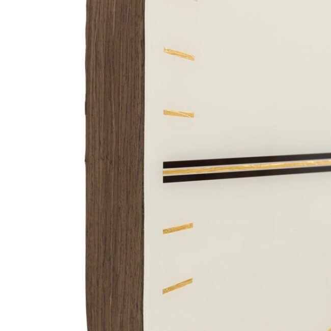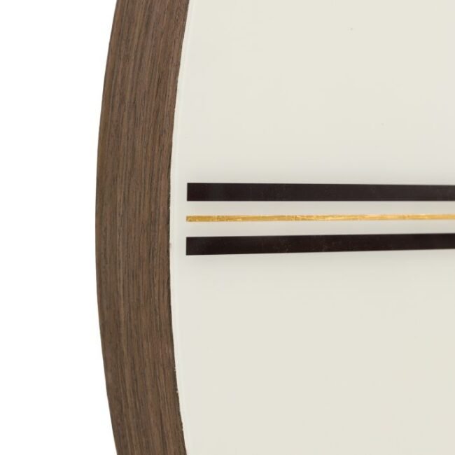 Neer Wall Clock: This eye catching clock reimagines modern timekeeping thanks to its soft geometry and refined detailing. Elegantly framed by a rich wood finish edge and a sleek snow white glass front, gold accents and minimalist markings create a sophisticated, contemporary look, perfect for interiors that embrace understated luxury and modern design.