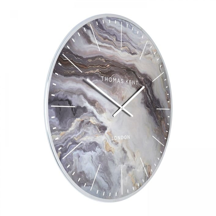 Oys Large Grand Clock: The 26″ Thomas Kent Oyster wall clock takes its inspiration from the irregular contours found in a mother of pearl. The elaborate bronze movements glide across the oversized clock dial. A spectrum of hues presents themselves behind a domed glass lens. A gold foil rim, along with matching hands put the finishing touches to this sophisticated feature piece.