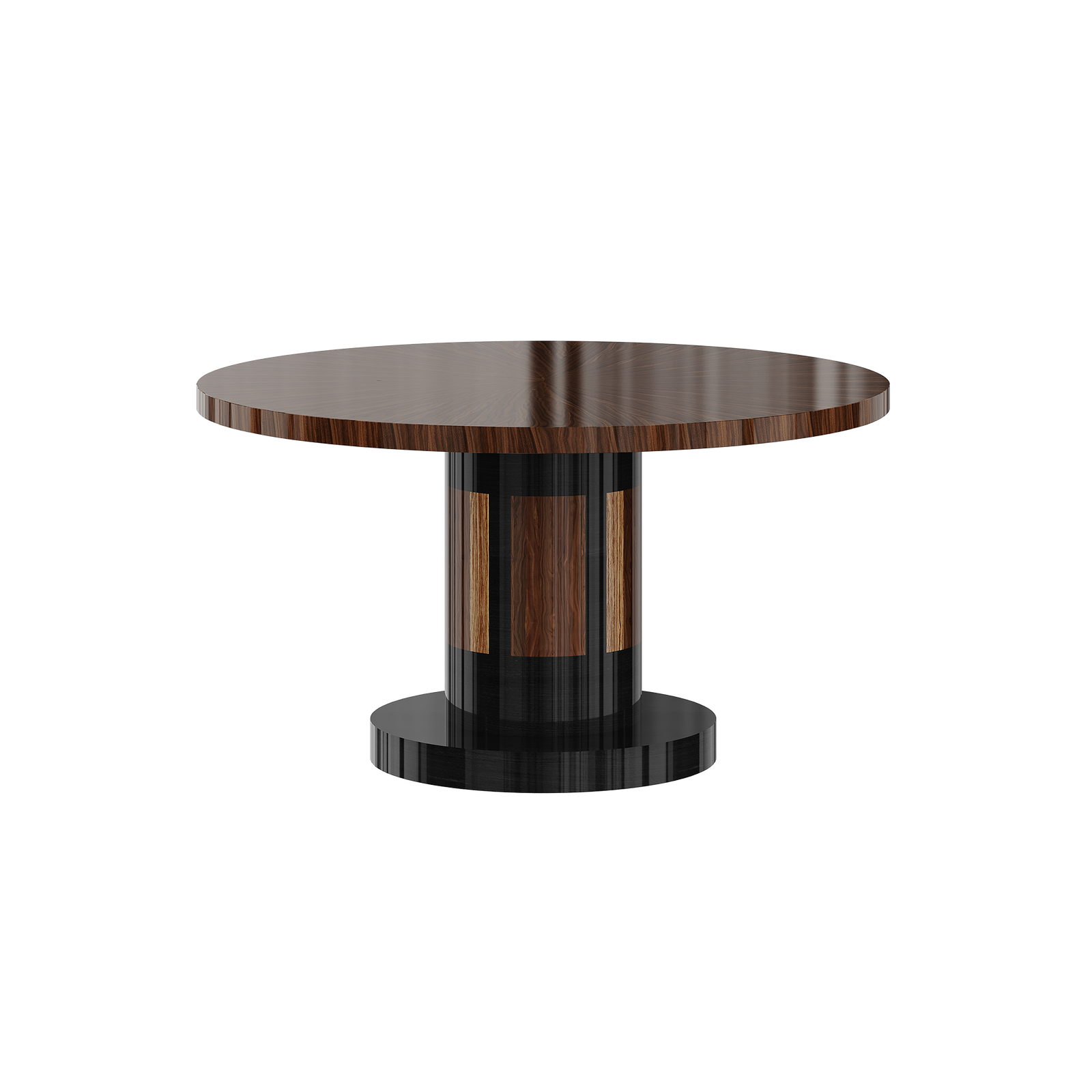 The Almada Dining Table is a stunning round dining table that effortlessly blends Art Deco-inspired elegance with a touch of Mid-Century Modern charm. This contemporary reinterpretation of a timeless design features a finely crafted wooden structure that brings warmth, sophistication, and style to any dining space.