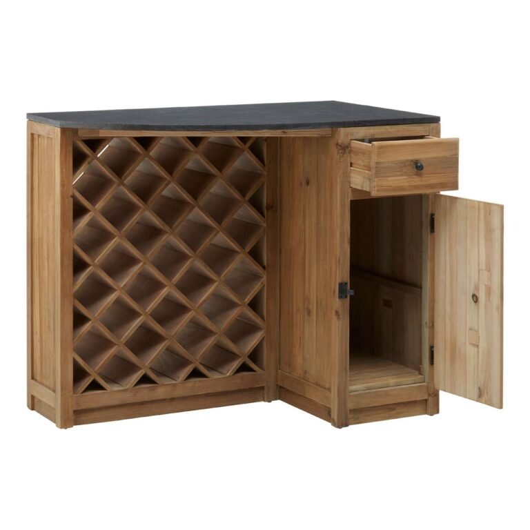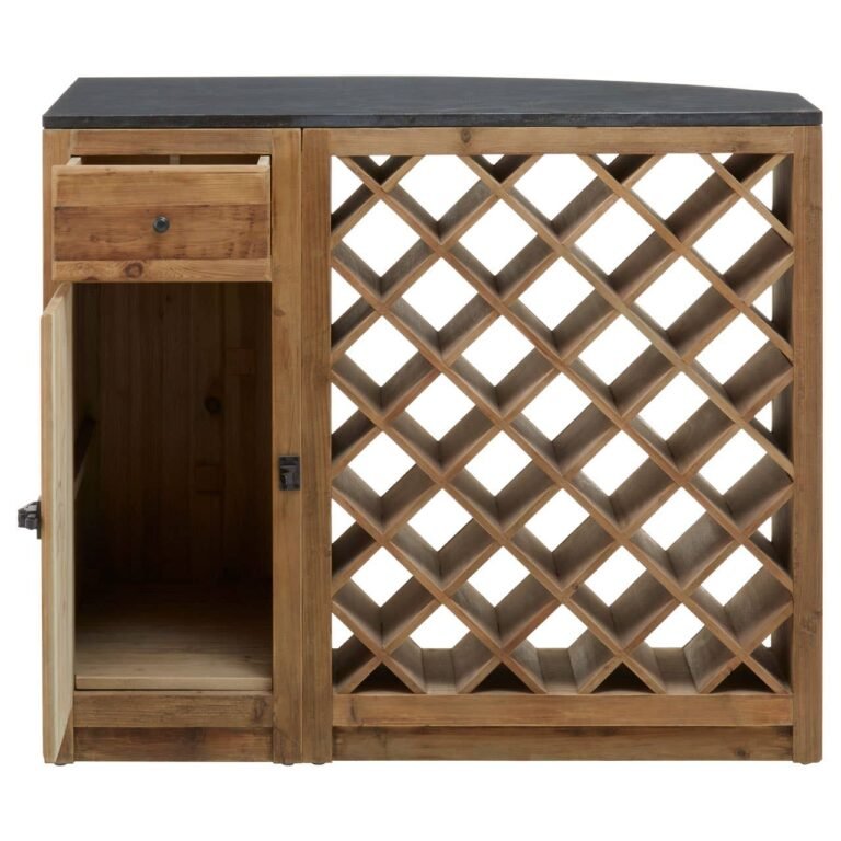 This bar island has a rustic feel thanks to the use of recycled pine wood and distressed metal. It features a large wine rack with a cupboard and drawer adjacent.