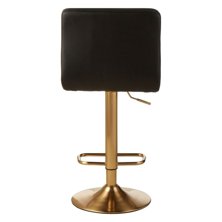 Aina Quilted Bar Stool: The Aina stool is upholstered with soft faux leather and features a contemporary black finish. Its base and stand have a reflective gold finish for a sleek look. The footrest integrated into the stand offers added support. A handle is positioned under the seat, allowing the height to be adjusted easily.