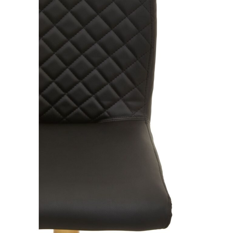 This Black Oie And Gold Bar Stool With Round Base features black leather effect padded seat with diamond pattern tufted back. Height adjustable with swivel action, the round gold finish pedestal base aligns with a minimal footrest and enhances luxe sophistication.
