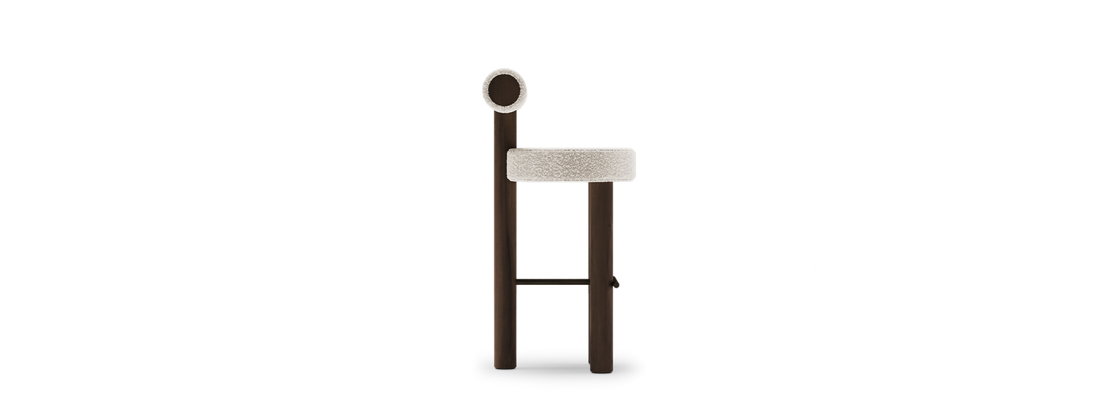 Freddo Bar Chair: In the Greek Freddo coffee, the hues and colours formed by the iced or cold milk over a scalding hot coffee served as the main inspiration for this item. This chic and minimal bar chair, like the drink, is a sublime and tasteful addition to a dining room or bar atmosphere, with the softness of the boucle seating and back, a walnut stain matte varnish in its two legs, and a long back in stainless steel dark bronze varnish, completing the highly contemporary and minimal design.