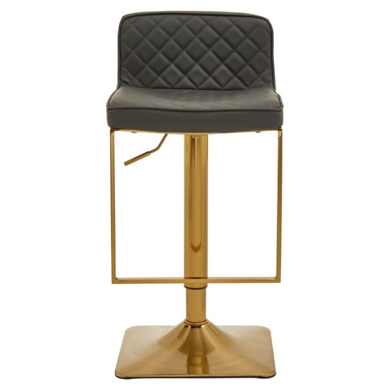 This Oie Dark Grey And Gold Square Base Bar Stool features a dark grey leather effect padded seat with diamond pattern tufted back. Height adjustable with swivel action, the gold finish square base aligns with a minimal footrest and luxe sophistication.