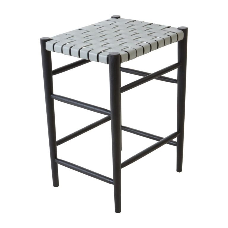 Stirling Bar Stool straight legs are crafted from eco-friendly teak wood and have a sleek black finish. Straps of genuine grey cow leather form a lattice pattern across its top, creating a comfortable place to sit. Part of the Stirling collection, this stylish stool can be styled with boho-inspired furniture and accessories.