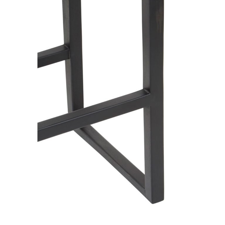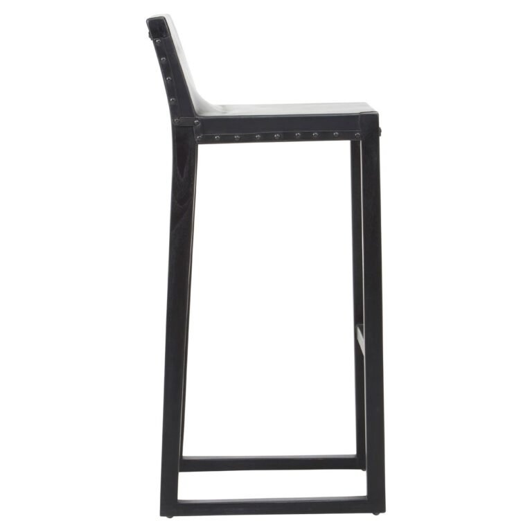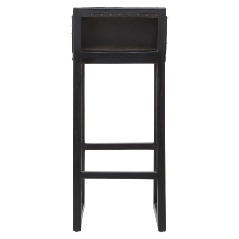 Stirling Black Stool sleek black palette gives the Stirling bar stool a contemporary, brooding character. The black leather which is used to dress the seat and backrest is trimmed with matching metallic studs. Its tall legs are crafted from sustainable teak wood, have a matching black finish, and feature a footrest for added comfort.