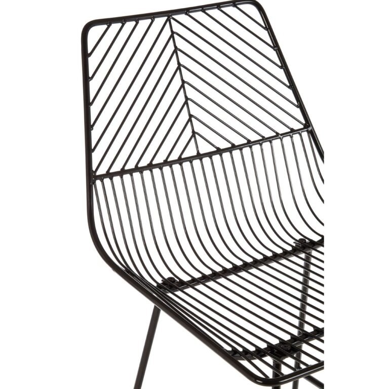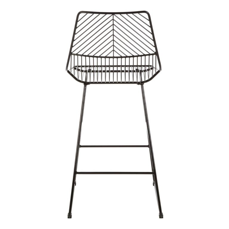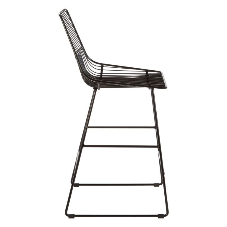 Tilsom Black Metal Wire Tapered Wire Chair: This highly contemporary bar chair achieves its minimal look thanks to the seat’s use of tough black metal wire. Its tapered backrest is divided into three sections, two of which are configured to give the wire design a leaf effect. The third lower section is composed of vertical wires that run through the length of the seat. It stands on elongated A-frame legs which support a wireframe footrest.