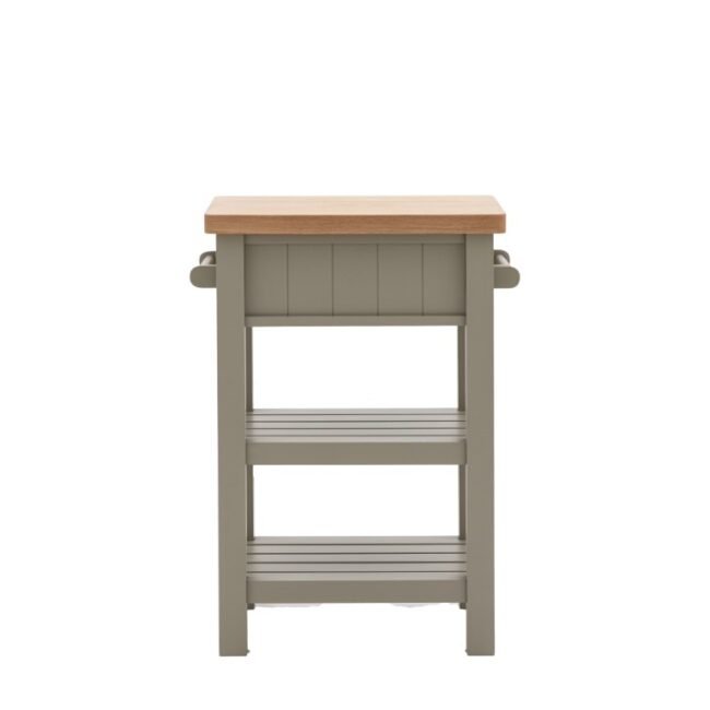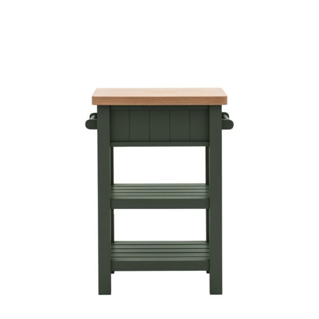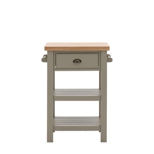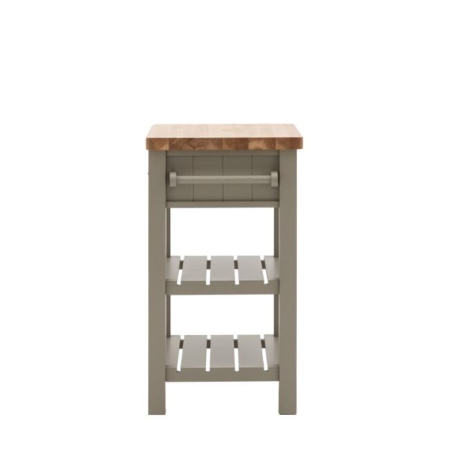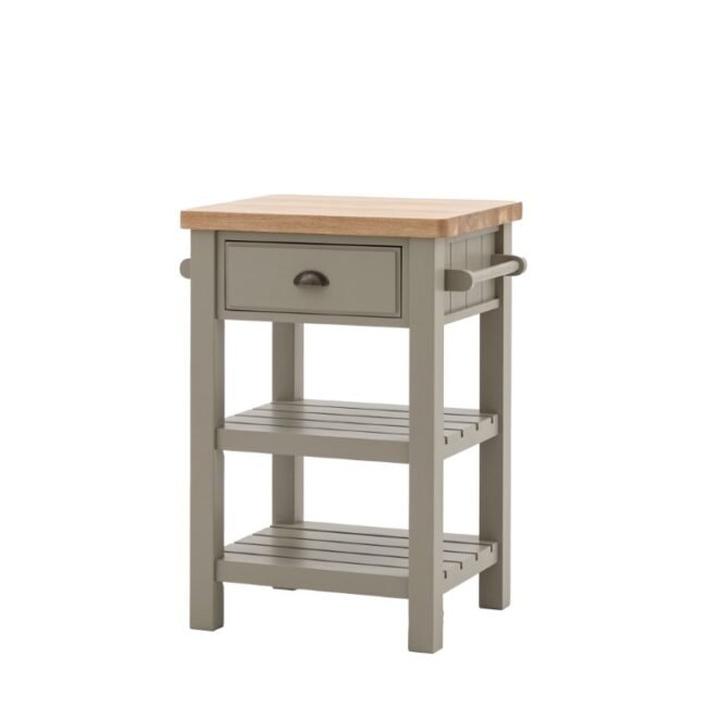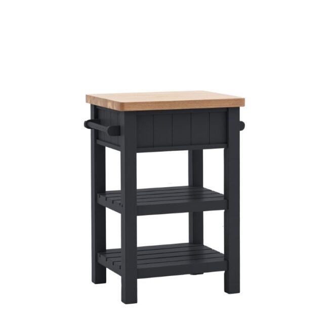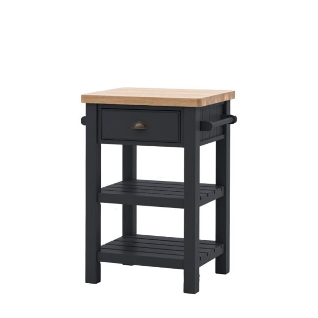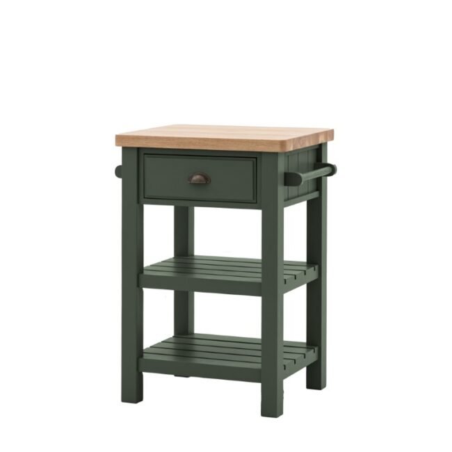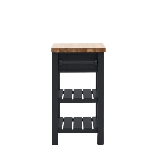 Add a little extra workspace and storage to any kitchen. With a solid oak top sturdy enough for daily use, 2 shelves, handy hanging rail and drawer, this butchers block is a practical addition to any kitchen. With its hand painted base and metal drawer handles, this block offers a modern take on traditional style. Please note: due to the nature of the natural oak top the final colour may vary.