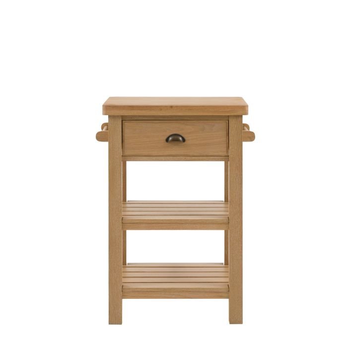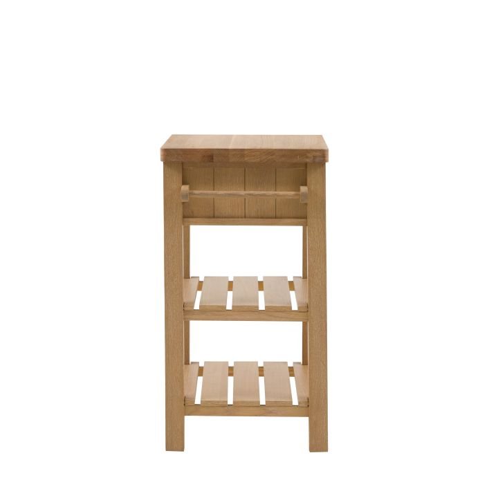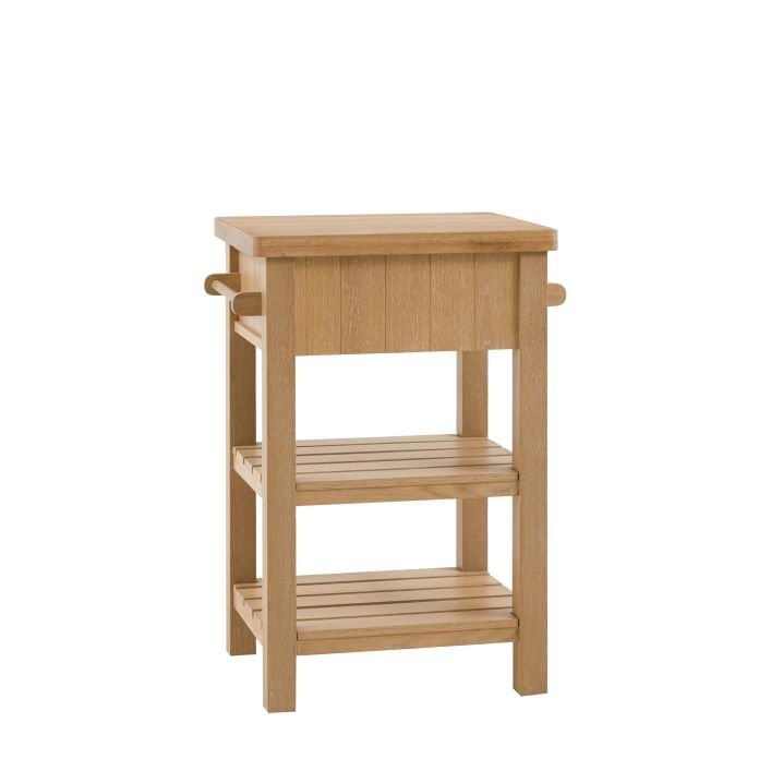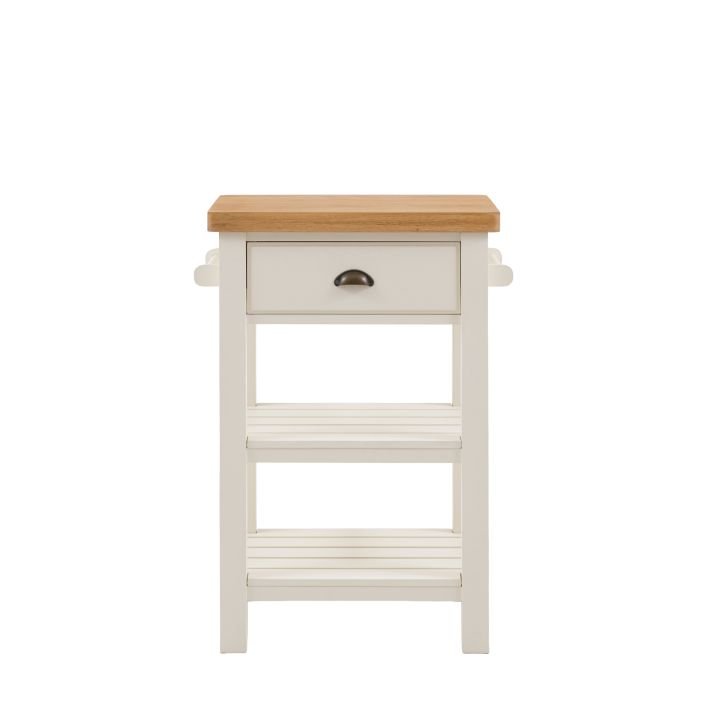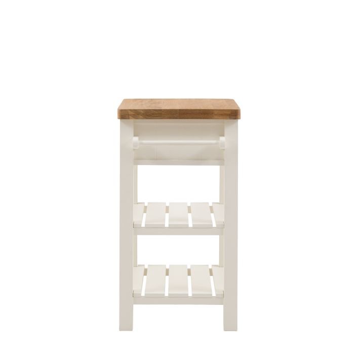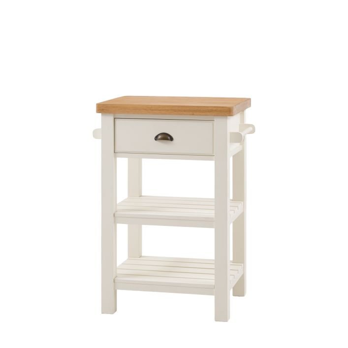 Etonette Butchers Block: Add a little extra workspace and storage to any kitchen. With a solid oak top sturdy enough for daily use, 2 shelves, handy hanging rail and drawer, this butchers block is a practical addition to any kitchen. With its hand painted base and metal drawer handles, this block offers a modern take on traditional style. Please note: due to the nature of the natural oak top the final colour finish may vary.