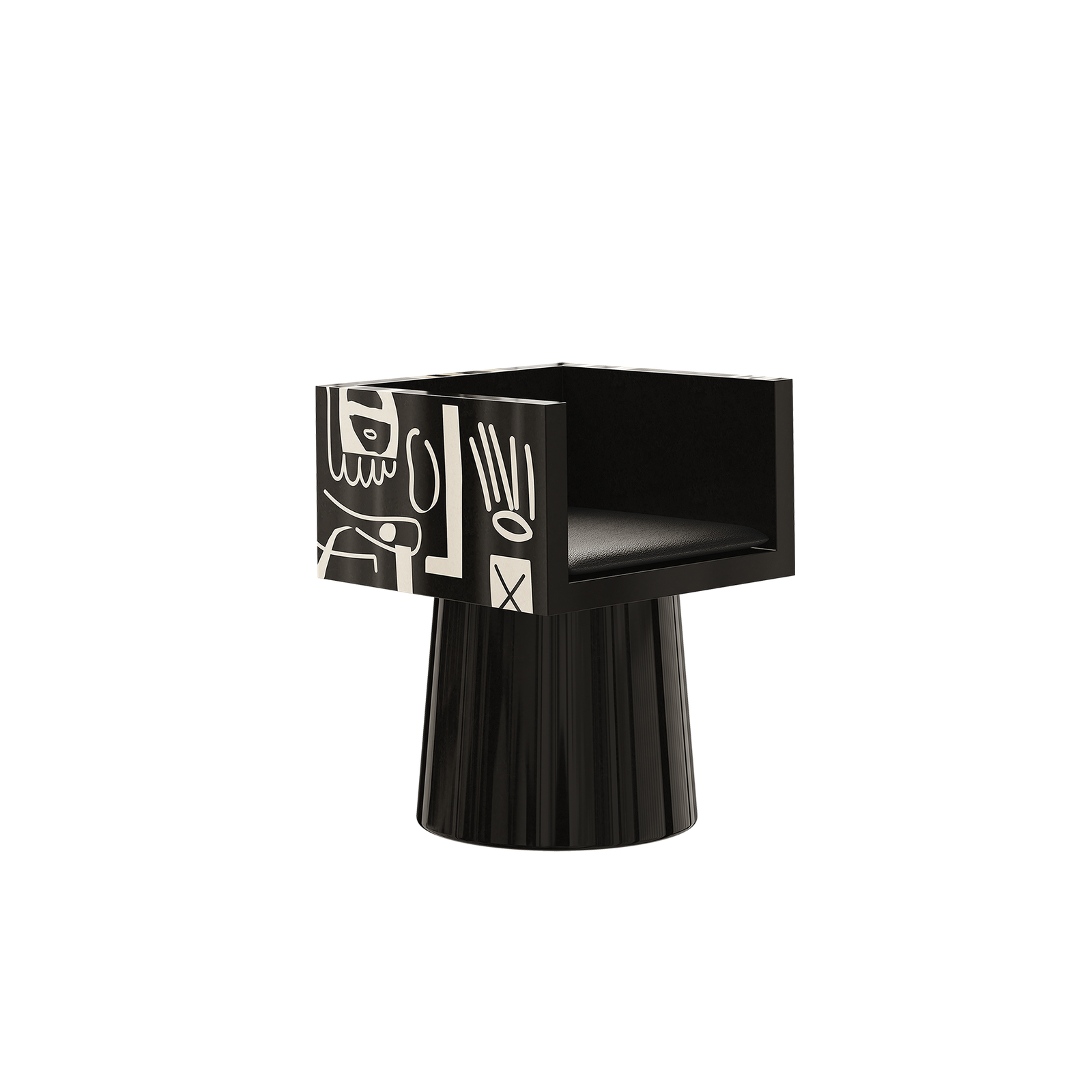 The Cubo Chair is a modern dining chair that is both functional furniture and an art piece in your dining room decor. Crafted from black lacquered wood, it features an abstract pattern on the backrest, making it a unique statement of exceptional craftsmanship.