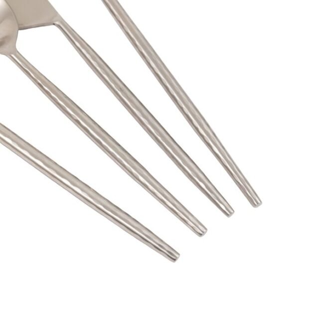Lora Cutlery Set of 16: Sit down to a meal in style with this 16 piece cutlery set. Featuring a soft gold finish and eye catching hammered textured handles for added shine. Dishwasher safe.