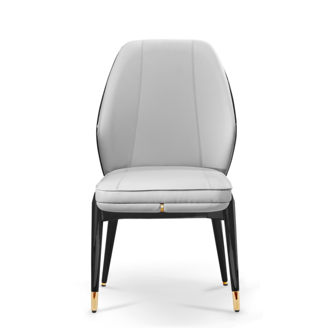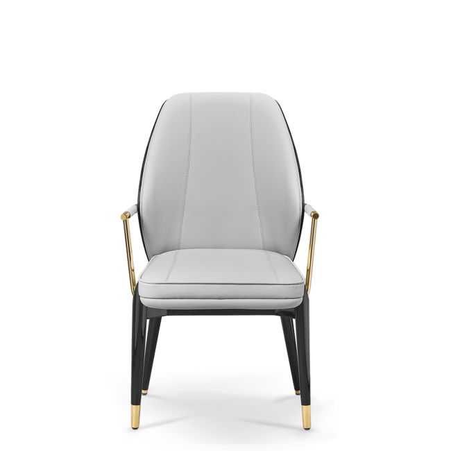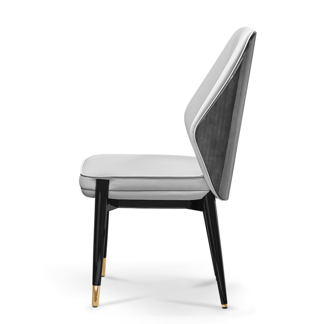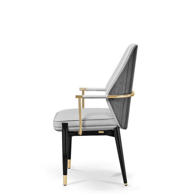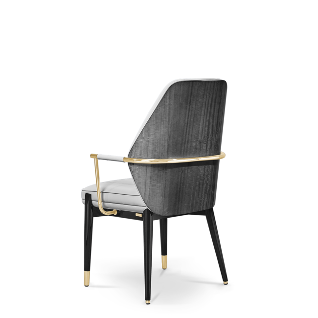The Algerone Dining Chair was designed as a neutral element for any sophisticated dining room area. Grey synthetic leather dresses its structure, while brass and wood details introduce a sense of modernity and timelessness.
