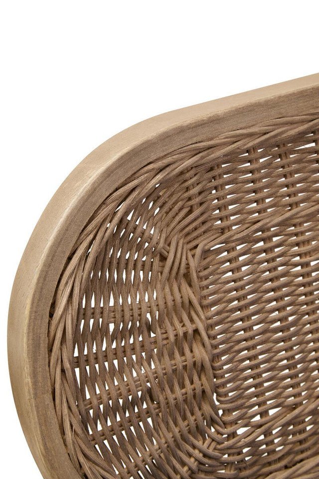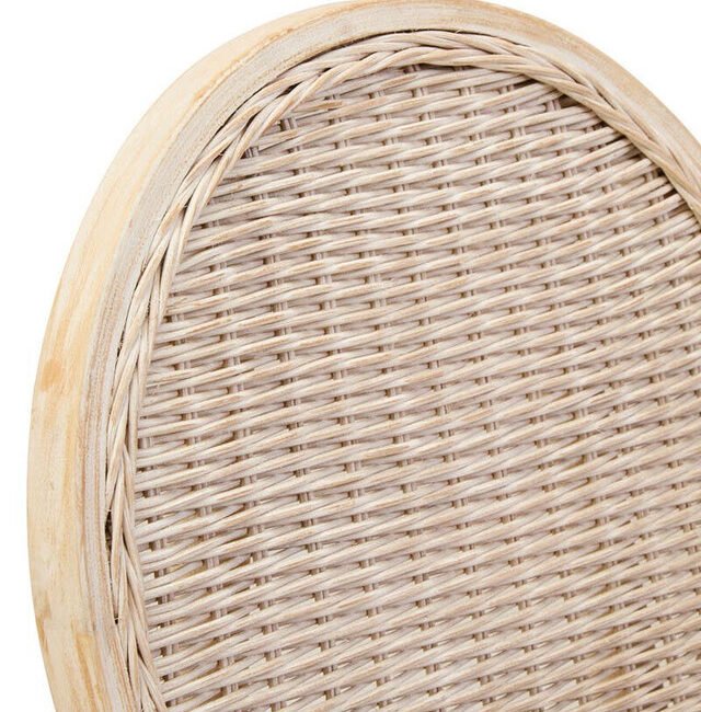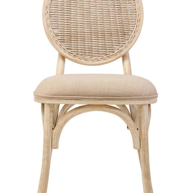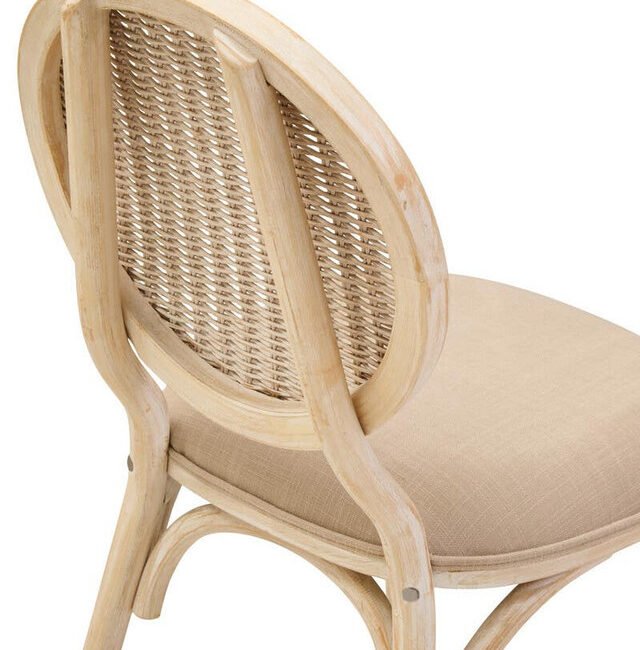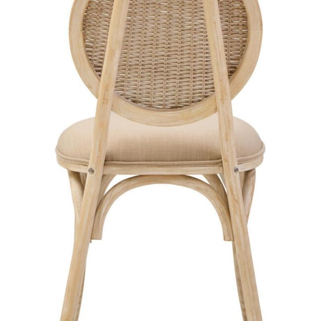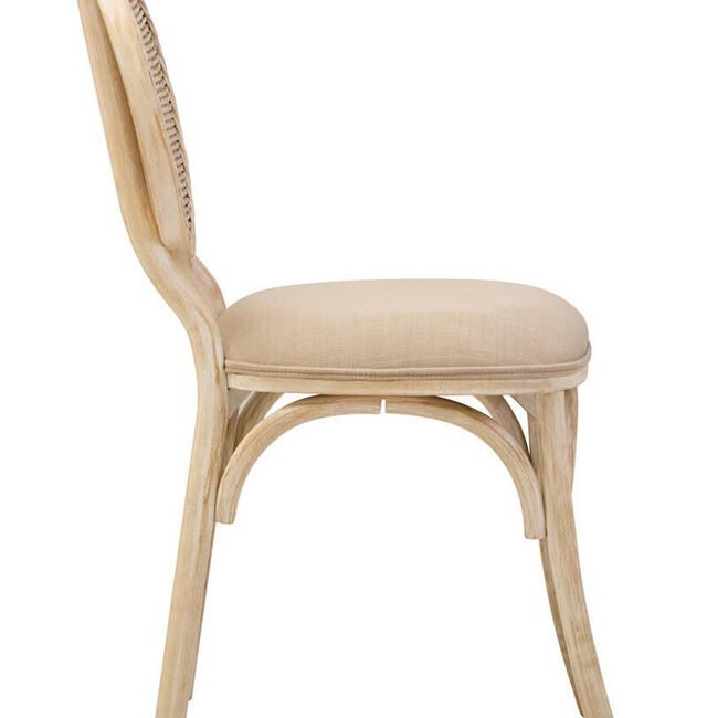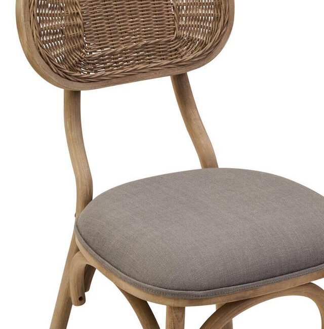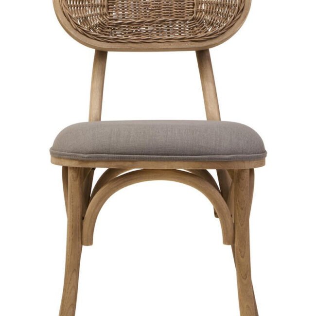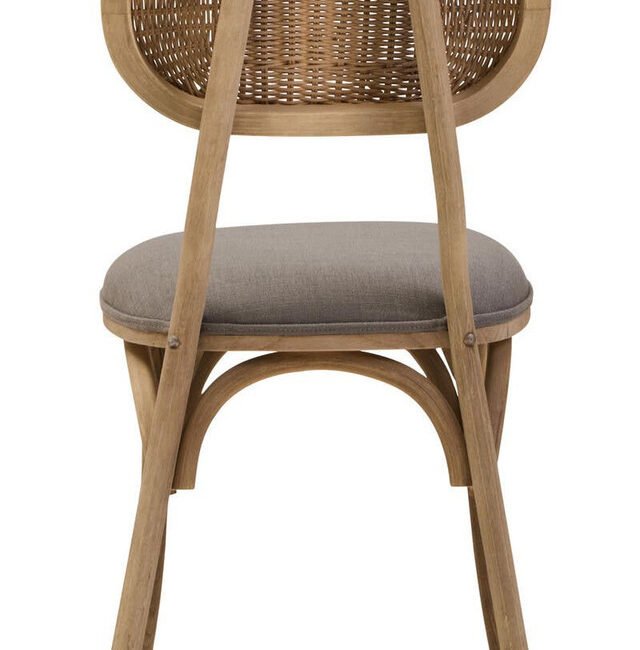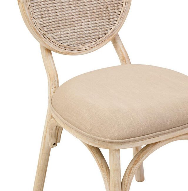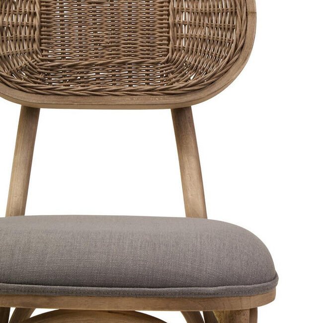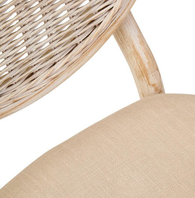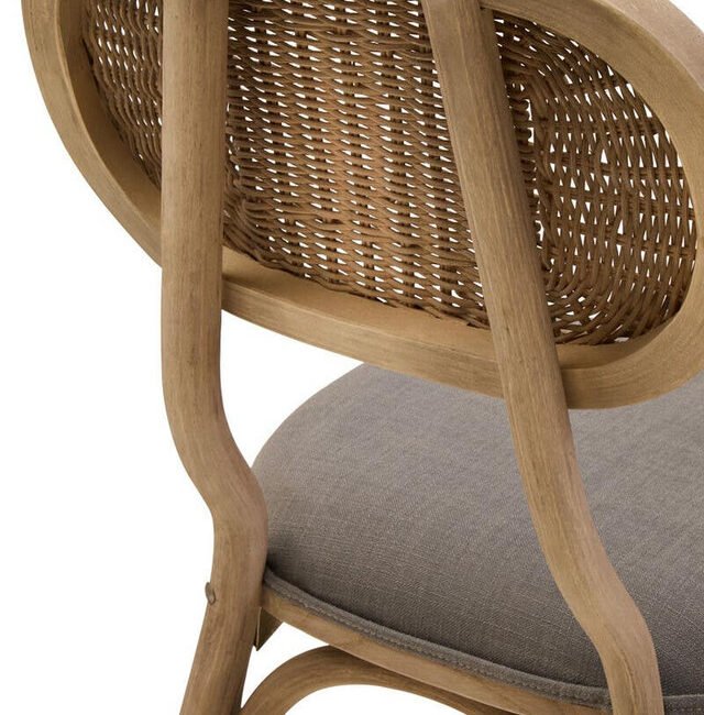 Ebu Elm Wood Dining Chair: Featuring a white wash / grey wash elm wood frame, this modern dining chair boasts a sculpted silhouette with a cane woven backrest. A beige fabric seat offers a comfortable seating experience. A blend of rustic charm and refined comfort, it adds a relaxed, timeless aesthetic to dining spaces.