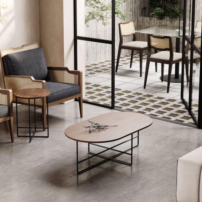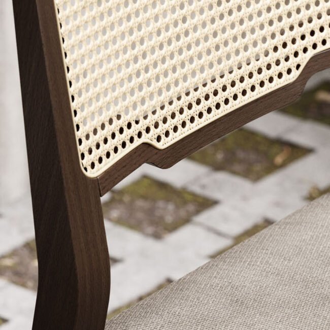 Both chairs are crafted with high-quality materials. The pictured version showcases a luxurious Clarence BS 13 fabric structure for a soft and inviting touch. The frame is constructed from walnut-stained ash, adding a touch of warmth and natural beauty to the piece. The finishing detail lies in the natural woven work accents that add a subtle textural element and elevate the overall design. The Eva Chair collection offers a perfect blend of comfort, style, and quality, making it a valuable addition to any home environment.
