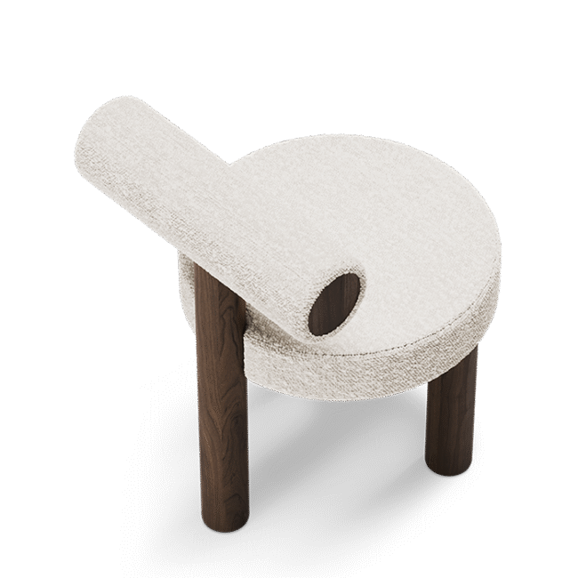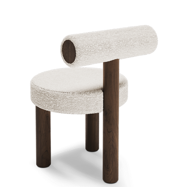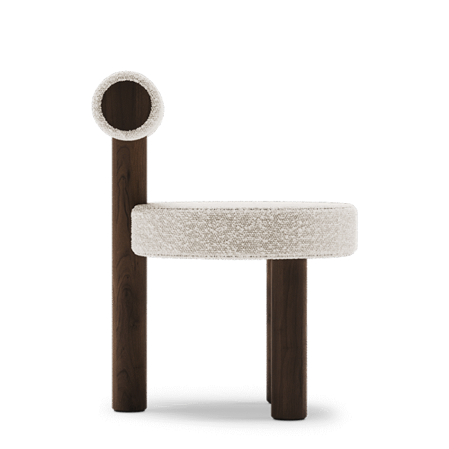 Freddo Dining Chair: Inspired by the mix of hues and colours created in the iced or cold milk over a steaming hot coffee in the greek Freddo coffee. Like the drink, this chic and minimal dining chair is a sublime and tasteful addition to a dining room, with the softness of the boucle seating and back, a walnut stain matte varnish in its two legs and a long back in stainless steel dark bronze varnish, complete the highly contemporary and minimal design.