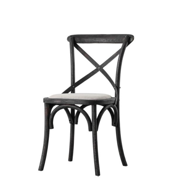 A pack of 2 understated cross back chairs in a distressed black finish with canvas seat pads. Ideal for casual dining creating a relaxed French cafe feel in the home.