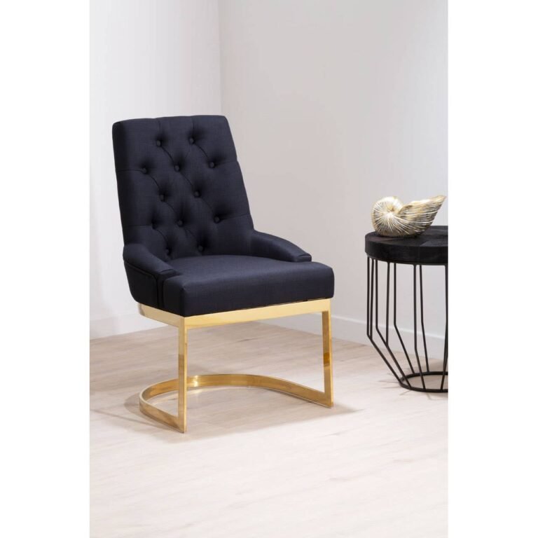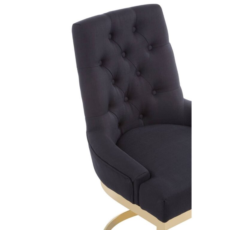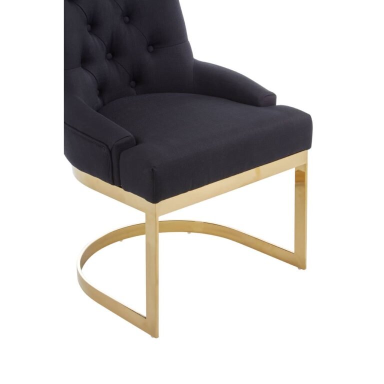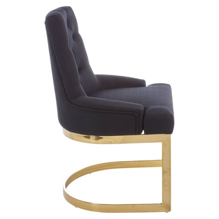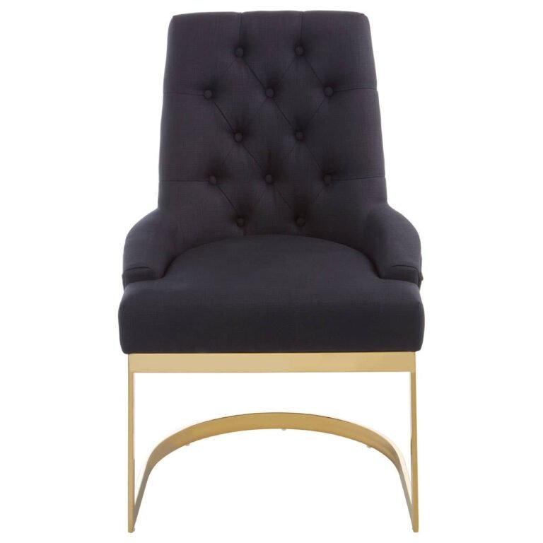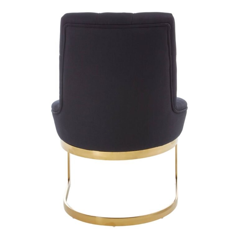 This chair is upholstered elegantly with premium-quality linen boasting a button-tufted back with gliding arms and a dense-foam padded seat. The sturdy metal base in gold finish lends an arching accent to the décor.