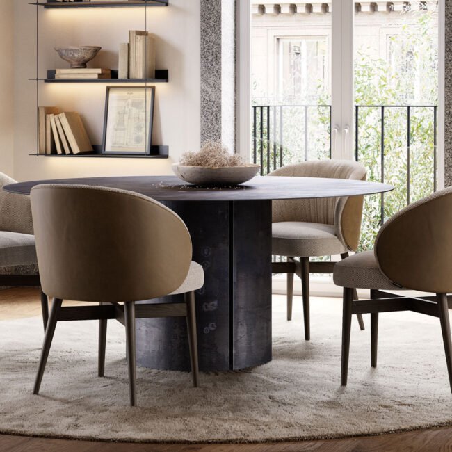 Norah truly invites personalization. The contrasting upholstery on the seat and backrest allows you to play with textures and materials. Imagine the luxurious feel of plush velvet on the seat paired with the refined elegance of natural leather on the backrest. The possibilities are endless! Beyond its visual appeal, Norah prioritizes comfort. Its simple yet balanced proportions and shape ensure a relaxing and enjoyable dining experience, making it a perfect choice for both intimate gatherings and lively family meals.