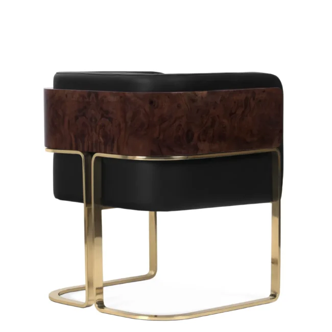 Featuring a uniquely shaped backrest, the Nura Dining Chair is the ultimate expression of cozy luxury. Shaped like a U, Nura is made of leather, brass, and wood and provides an embracing comfort only found in upholstery solutions with the same shape. Ideal for cozy yet glamorous dining rooms and restaurants.