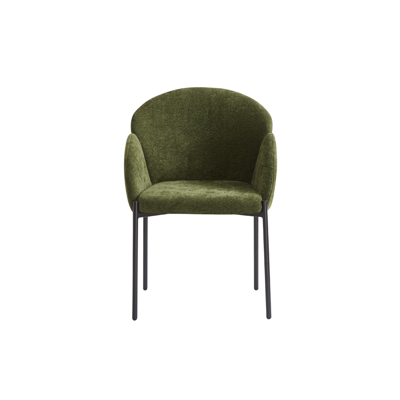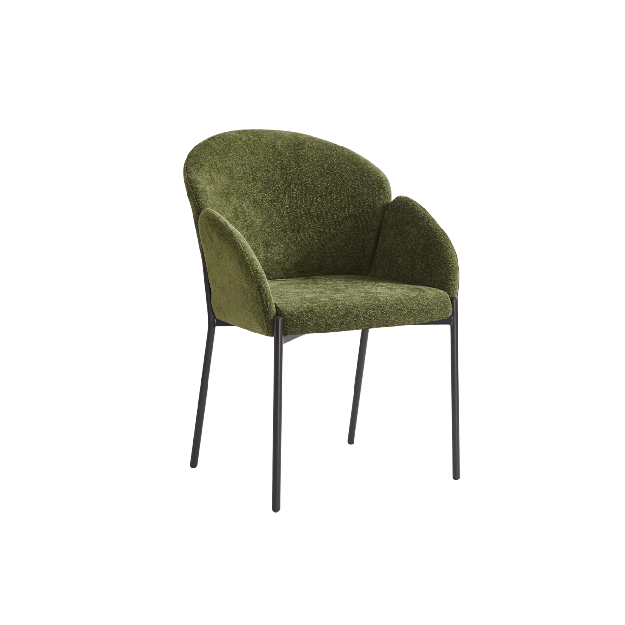 The Petal Dining Chair combines everyday functionality with a stunning design reminiscent of a blossoming flower. Its frame is made up of black, powder-coated metal, crossing under the seat and soldered to the legs which partially extend beyond the seat in the front and at the back. The chair is upholstered in flame-retardant fabric, creating a soft contrast with the metal legs. Ample cushioning adds extra comfort, while the backrest and armrests gently curve outwards and away from the seat, forming an inviting profile without sharp edges. Overall, the Petal Dining Chair is a versatile choice for contemporary dining spaces.