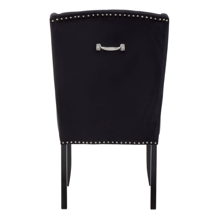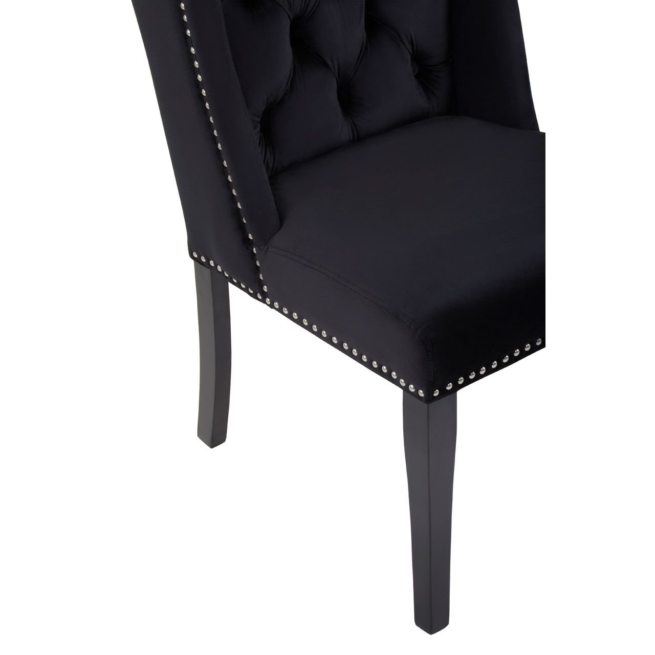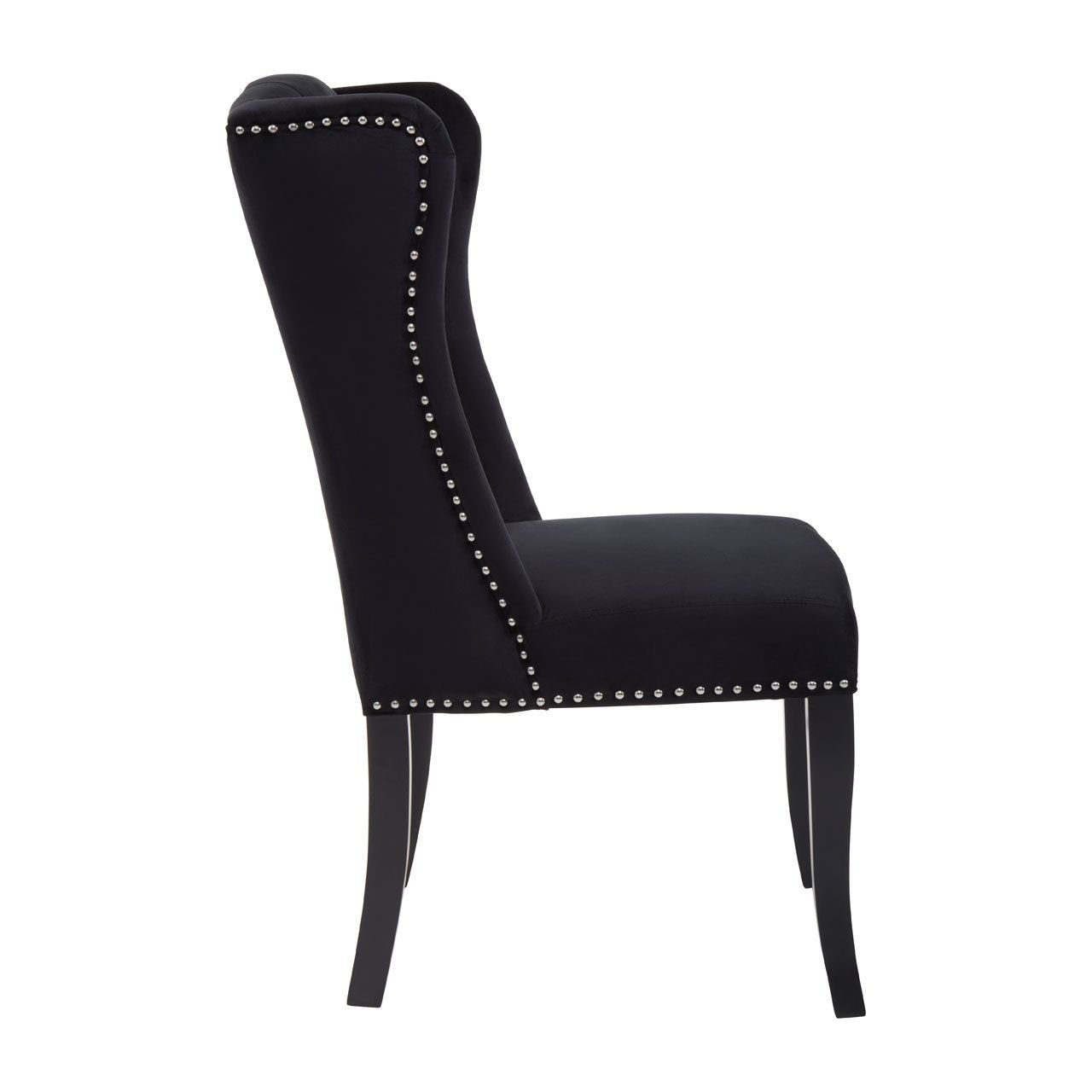 Regents Townhouse Black Velvet Dining Chair: Wrapped in black velvet, this dining chair has padded seat featuring metallic stud trim with button tufted winged back. Antique finish rubberwood legs are slightly curved to complete the timeless aesthetic.