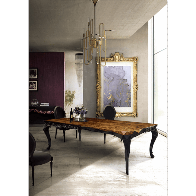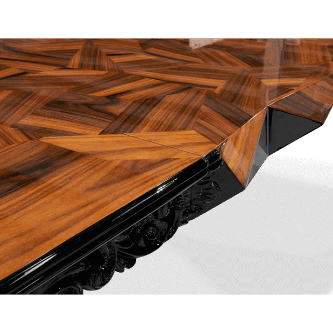 The Royal is a real step forward for Boca do Lobo. It’s hand carved details of the intricate marquetry design and finishes, are executed with amazing precision by our artisans. Made from wood, each of it’s details are executed with precision, from it’s frame in a baroque and minimalist faceted style, to it’s unique table top, in a palisander veneer patchwork collage, finished with a high gloss varnish. This extraordinary piece combines new design and architecture trends, but never forgetting the rich tradition of the past. The dual personality of this table is beautifully combined, Baroque meets clean lines, while reflecting Boca do Lobos philosophy of challenging the past through the future.