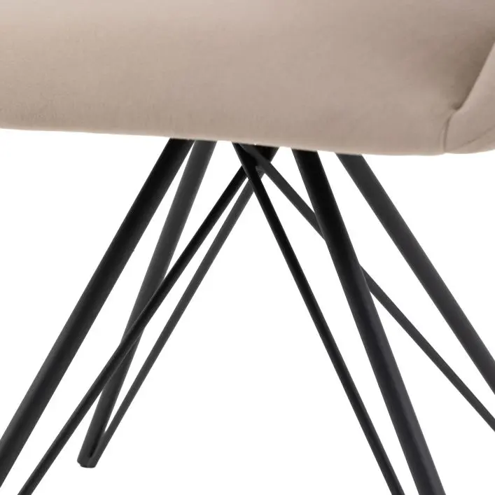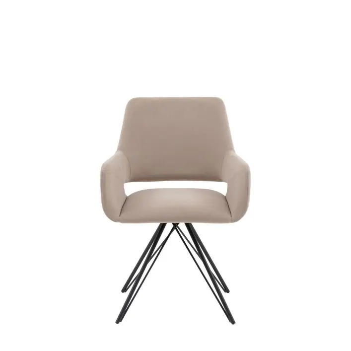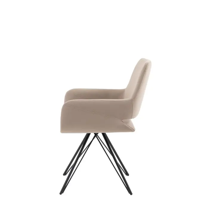 Vorno Dining Chair: Made to add standout style to a dining space, these chairs are a modern and eye catching addition. The striking black metal legs have an architectural influence, contrasted by the curved, fully upholstered seat. With a high back, smooth curves and comfortable armrests, this chair brings comfort and style to a modern dining space.