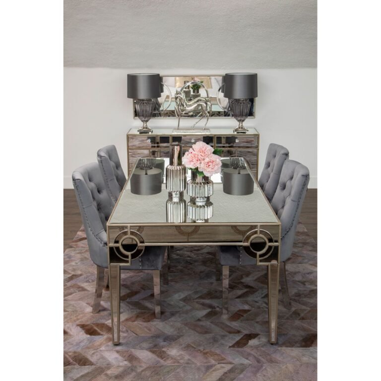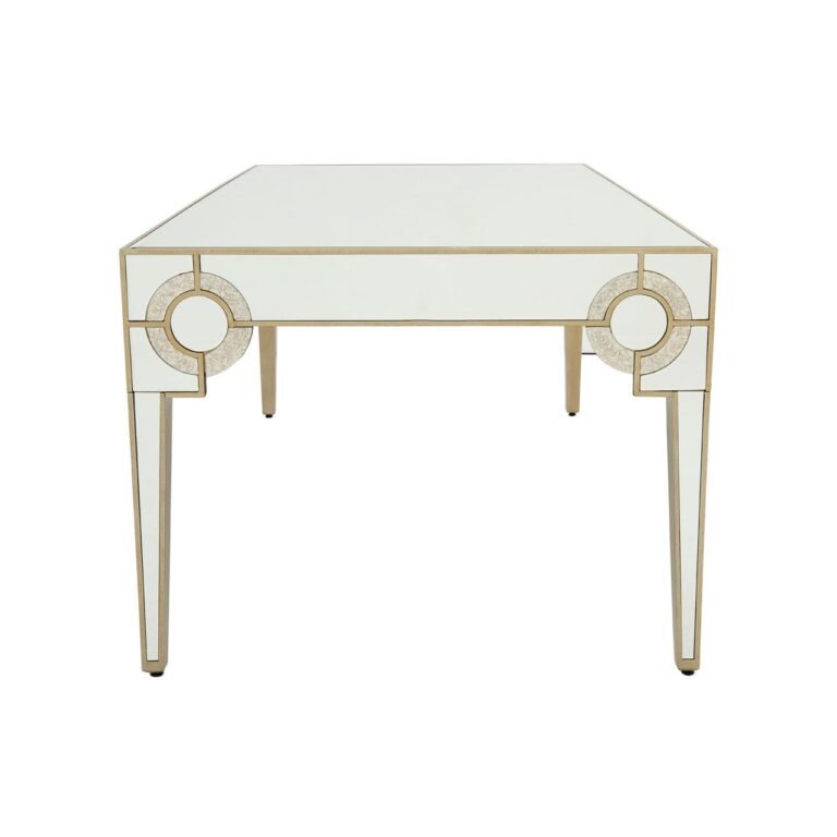 Alnwick Dining Table: Each corner of the dining table is decorated by a segmented circle motif made using antique-finished mirrored glass.