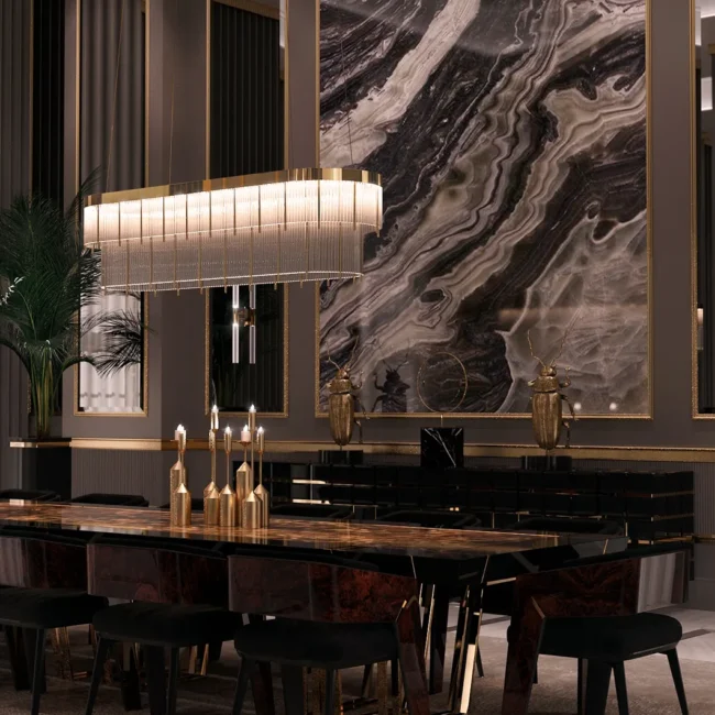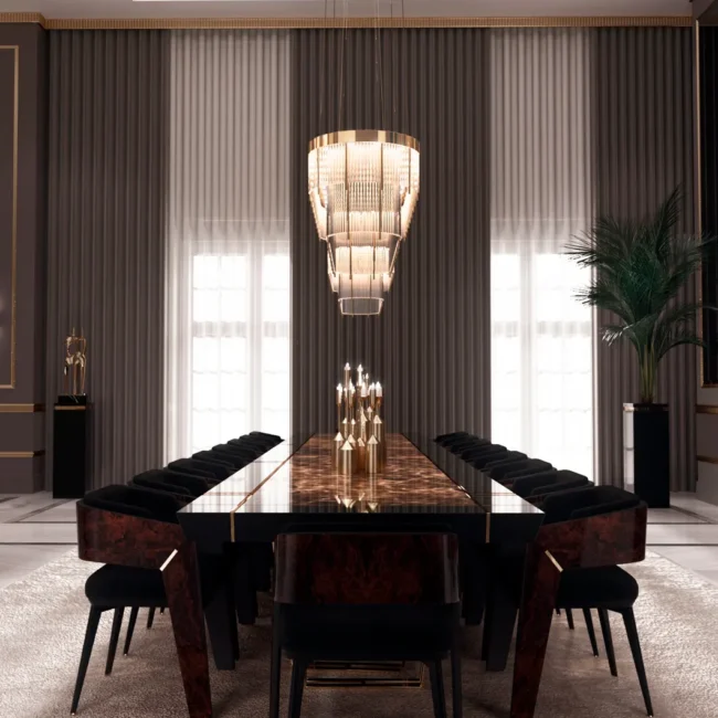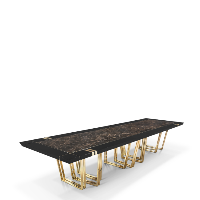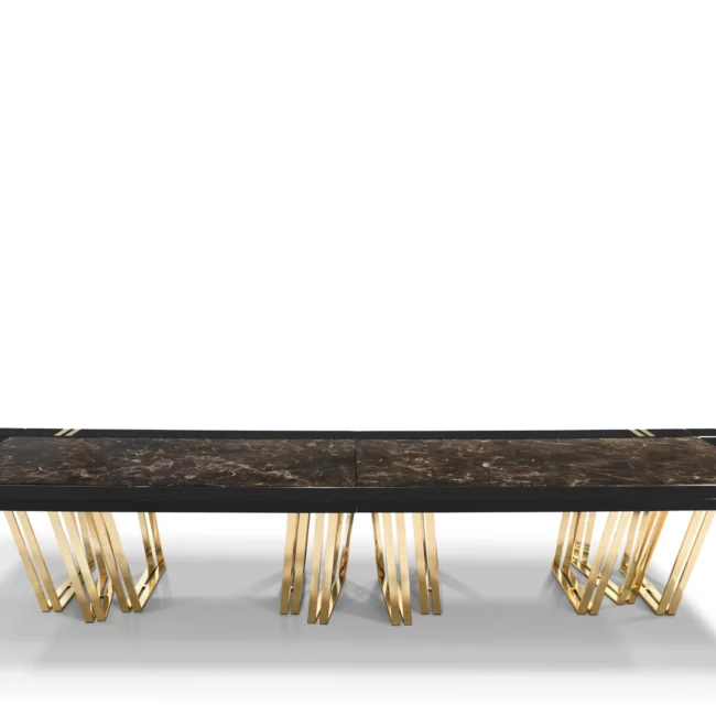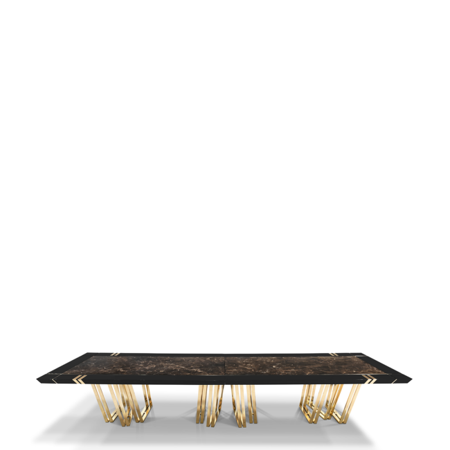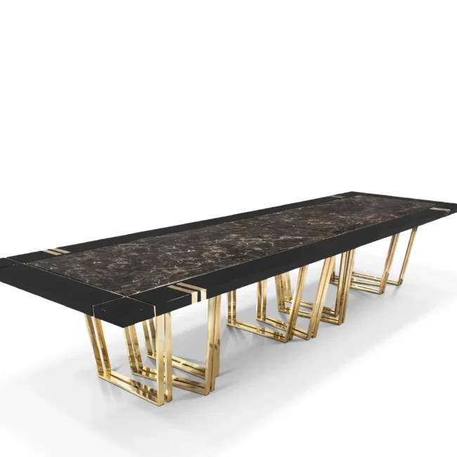 With its impressive 4-meter size, the Apotheosis XL Dining Table becomes the focal point of any dining room decor with its Greek mythology inspiration and modern lines. This combination of high-end materials such as brass, wood, and Emperador marble creates a striking visual impact on any project.MATERIALS