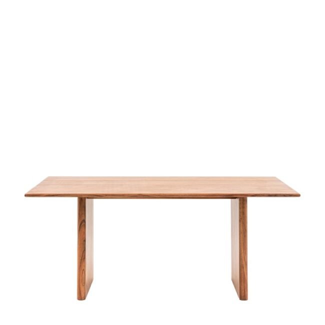 Stunning contemporary design dining table. Crafted from solid acacia wood with a warm natural finish which shows off the beautiful grain of the timber, the table offers a sturdy yet elegant look. The solid legs have soft curved ends and the tops have rounded edges to echo this. The table is available in a larger size and there are also two sizes of dining bench.