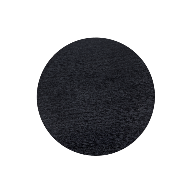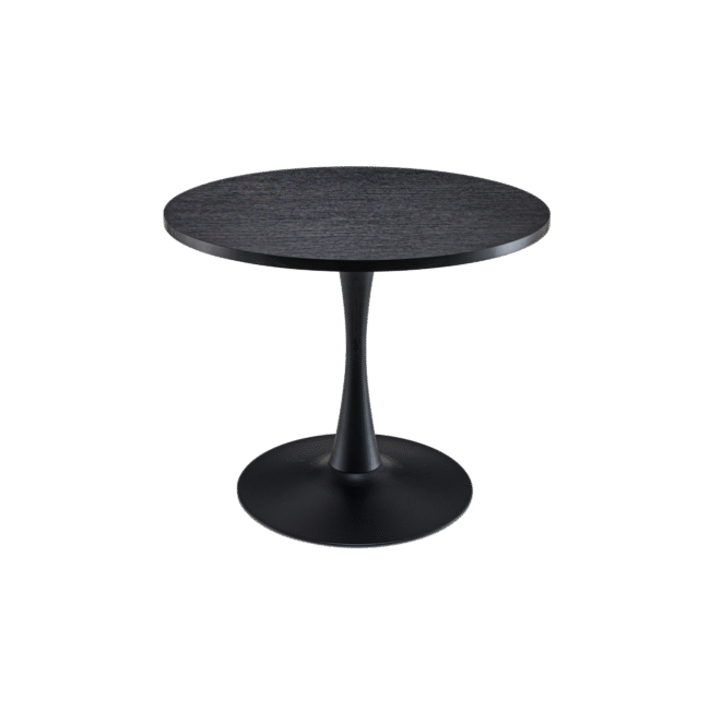 The Celeste Round Dining Table combines a sleek silhouette with modern style. The design boasts a sturdy metal base connected to the tabletop by an hourglass-shaped support, creating a striking focal point. The top is finished in black with a subtle woodgrain effect, creating a refined look. Its round shape and compact size make the Celeste Dining Table the ideal piece for contemporary dining spaces in one or two-bedroom apartments. Pair with our Flora Chairs for a stylish dining corner.