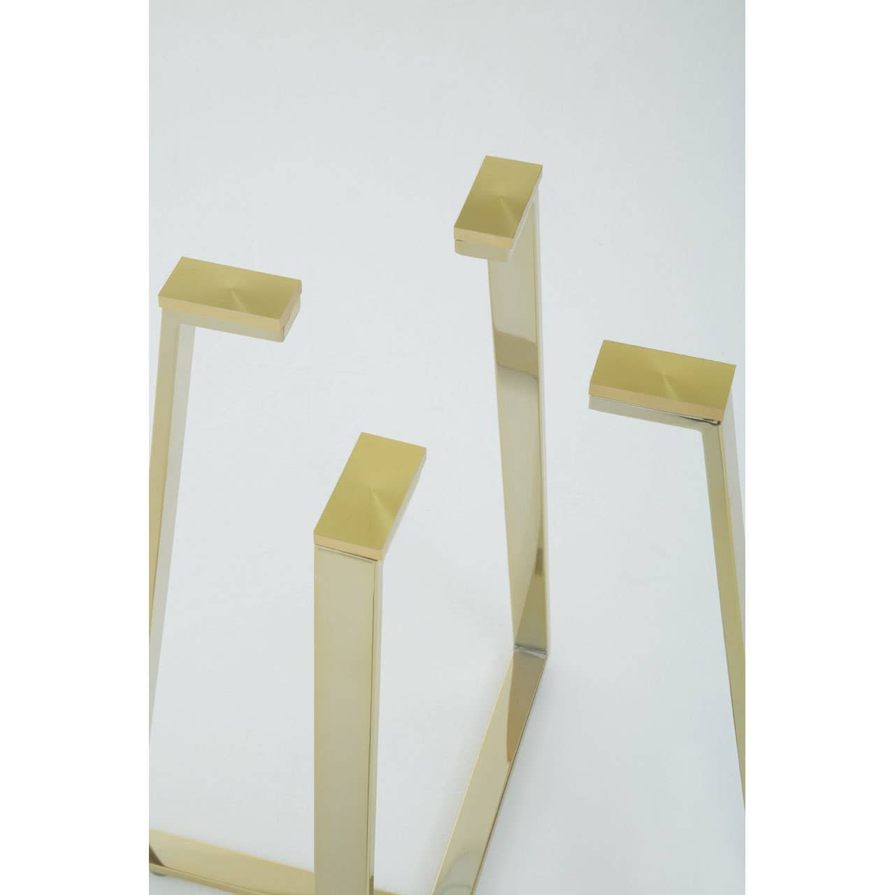 This table adds a chic statement to the interior with its understated design and geometric shape. The intersecting base of this table is given a warm metallic finish, and it is topped with a round translucent glass making it ideal for modern inspired homes.
