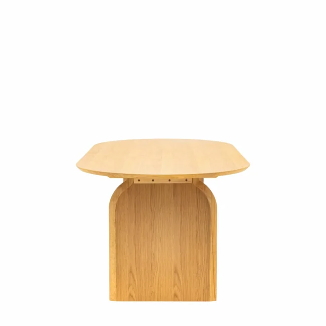 Designed to highlight the use of geometric design, with a nod towards retro style but in a more modern format, this beautiful dining table features a lovely elegant top with curved ends, with this form echoed on the tops of the legs. It is made using oak veneers and solids, where practical, with a natural matt finish. Matching pieces available.