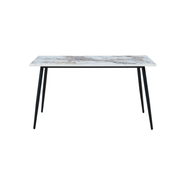 The Horizon Medium Dining Table Marble Effect is a sleek and stylish choice for modern dining spaces. Its elegant marble-effect finish, featuring subtle hints of yellow and grey, adds a touch of sophistication to any space. The matte black powder-coated metal legs taper outward, complementing the refined tabletop for a striking, contemporary look. Crafted from high-quality, responsibly sourced materials, it provides a durable, sustainable solution for compact dining areas.