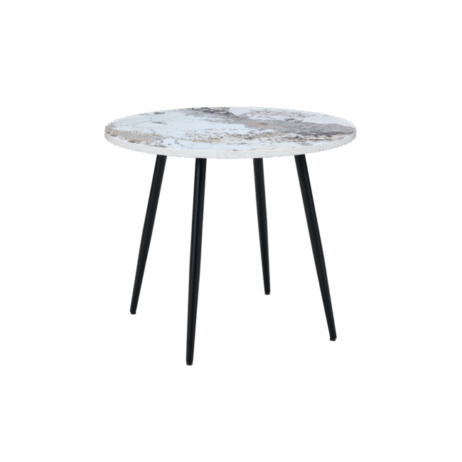 The Horizon Round Dining Table Marble Effect is a refined, practical centrepiece for smaller dining spaces. Featuring a smooth marble-effect top, it brings an elegant, modern aesthetic combined with a durable, easy-to-maintain surface. The sleek, matt black powder-coated legs, subtly angle outward, adding a contemporary edge to the piece’s aesthetic. Designed to seat up to four people, this table is perfect for stylish everyday dining in modern interiors. Thoughtfully crafted from durable materials, it supports sustainable living while enhancing your space.