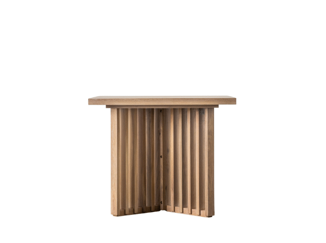 This dining table features solid oak slatted legs in a double chevron layout, to create an eye-catching and unusual design feature.