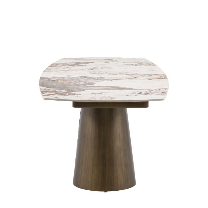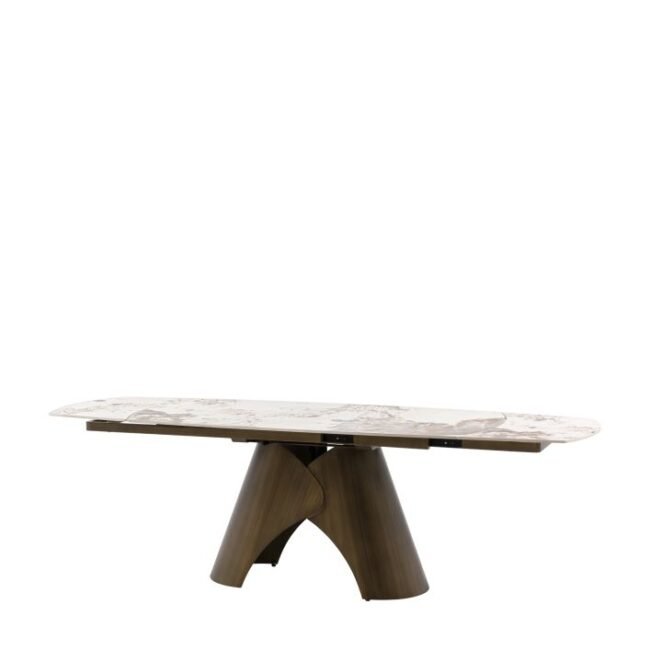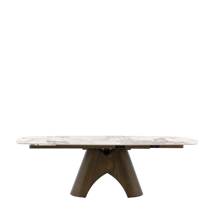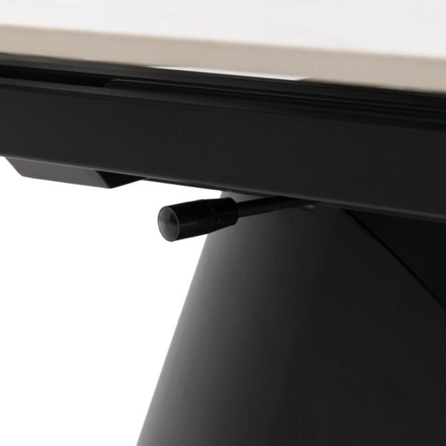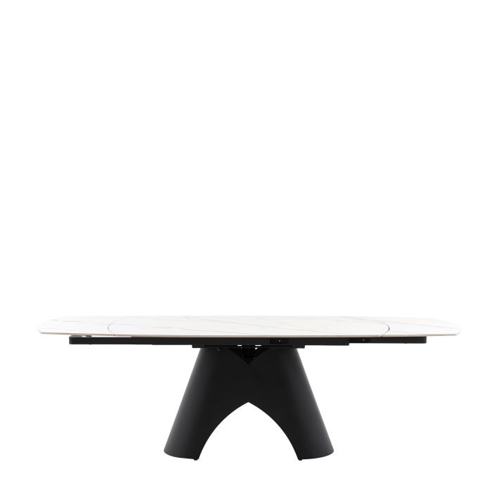 Ress Dining Table: The ultimate in sophisticated dining and practical versatility, this extending dining table brings effortless flexibility to any modern dining space. The clever extension mechanism allows the Carrara marble style ceramic top to rotate, smoothly revealing hidden leaves that transform the table from seating 6 to seating 8 with ease. Perfect for everyday dining or entertaining, the marble style top is complemented by a matt black metal base, adding a chic, stylish touch to a dining space.