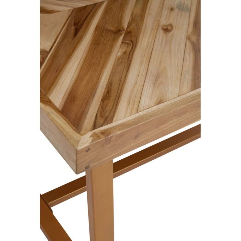 Stirling Natural Teak Wood Dining Table: The rectangular top of this dining table is handcrafted expertly from individual slats of natural teak wood, forming a herringbone pattern. The richly textured top of this table is perched upon a gold finish angular metal frame to add style with stability.