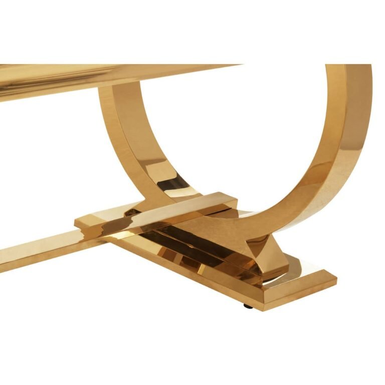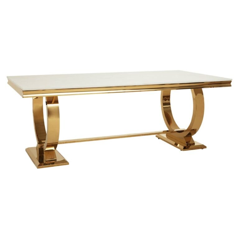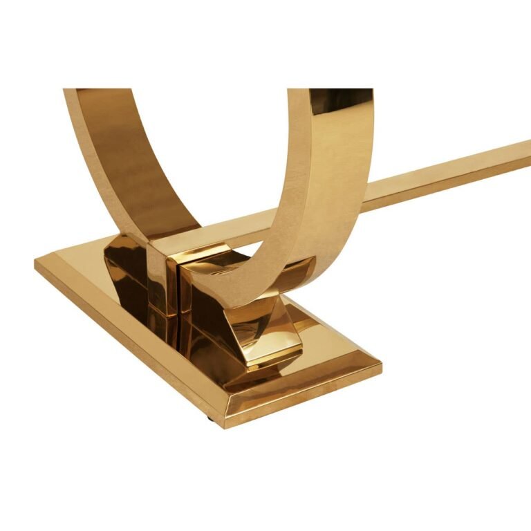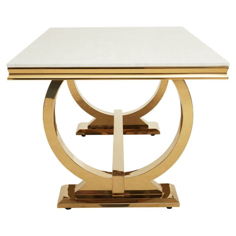This Todar Dining Table With Brushed Gold Base features an open circle accented trestle base built from stainless steel with a brushed gold finish, topped with stunning ivory white marble. The base frame showcases the uncluttered lines with the smooth marble top reflecting simplicity.