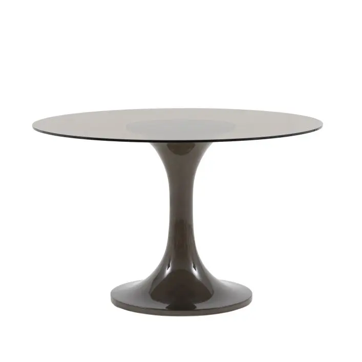 Voli Dining Table: With retro flair, this dining table is a stylish complement to any modern dining space. The sculptural, fluted base is crafted from reinforced glass concrete, finished in a rich charcoal brown glaze, creating a sophisticated depth and warmth. The table is finished off with a subtle brown tinted toughened glass table top, completing the look with a balance of contemporary Italian style and retro cool.