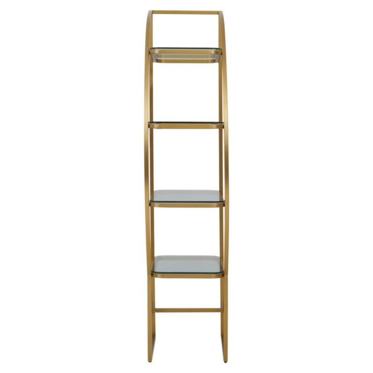 The Aiste left half moon shelf unit exudes modern retro opulence. The gold stainless steel frame is complemented by four sleek glass shelves.