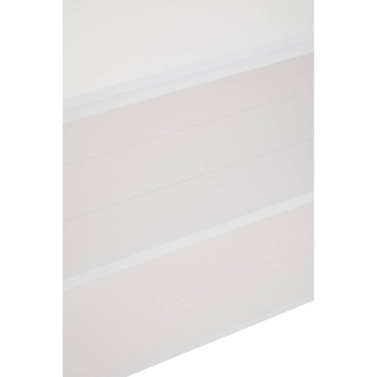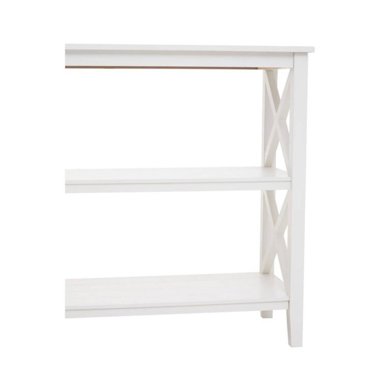 This bookcase has an ivory finish which accentuates a mild graining of natural pine wood. The sturdy rectangular design with crossed sides lends the table a decorative aesthetic while three open shelves offer plenty of room for storage.