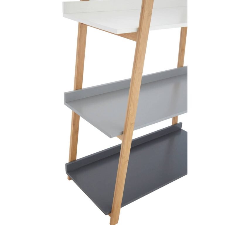 The sloping frame of this stylish shelf unit is made from sustainable bamboo wood. Delicately grained, the light wood frame rises in an A-shape, cradling five shelves. The black, grey, and white coloured shelves create a monochrome spectrum, giving this unit added visual appeal. Understated and practical, use it to display cherished ornaments and books.