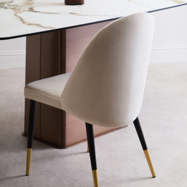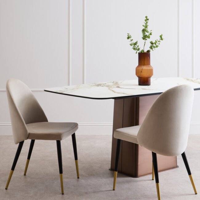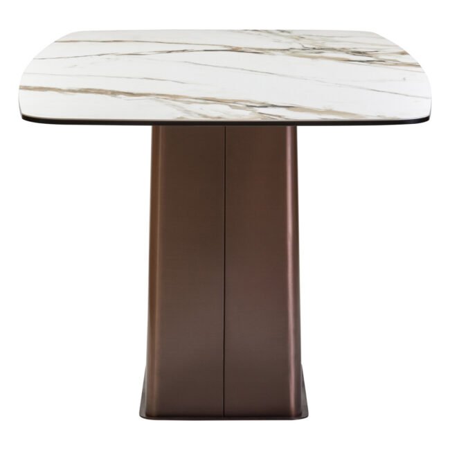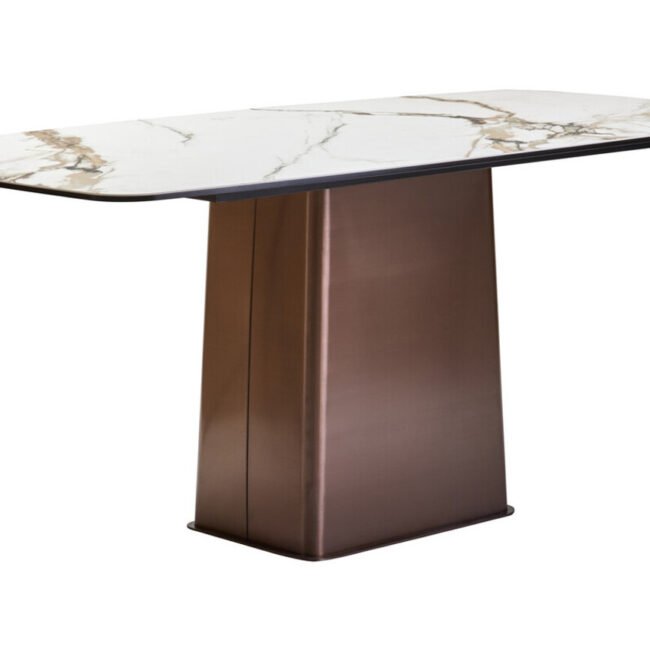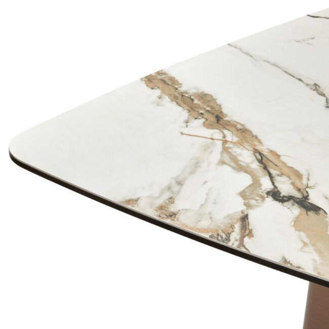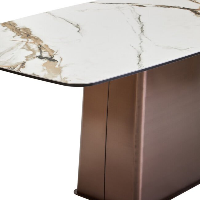 The Emperio White Ceramic Marble Effect Rectangular Dining Table features a stylish white marble effect ceramic top, offering a durable and elegant surface. It is supported by a striking brushed bronze stainless steel base, presenting a modern and luxurious aesthetic.