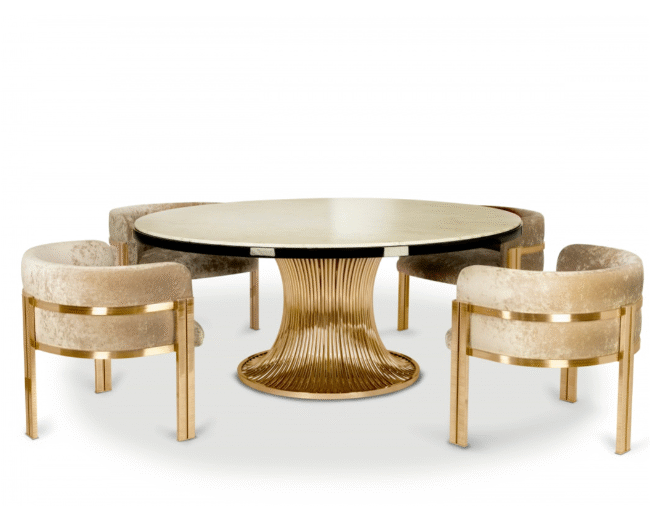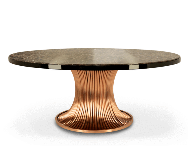 Featuring a unique design composed of bending brass tubes, the shape gives the idea of a continuous flow. The Flusso round dining table adds a touch of allure to any home interior and a feeling of mystery to the most exquisite décors.