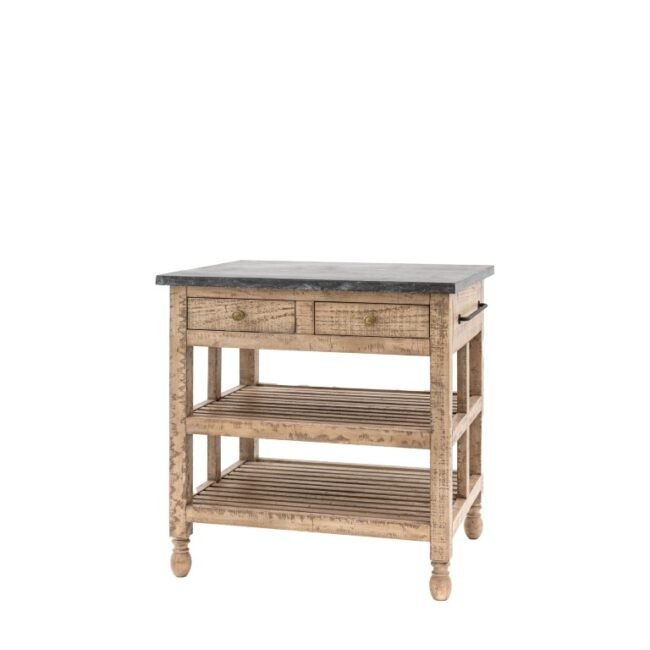 Offering an updated classic look, this lovely kitchen island combines style and practicality, with its marble top and two drawers and two shelves for storage. It is crafted from North American pine solids and veneers where practical, with the clever use of a mill saw giving characteristic features of cross sawn timber to create a tactile, dramatic finish. Matching pieces are available.