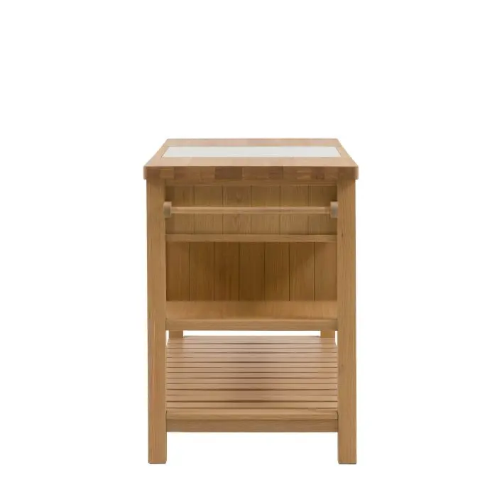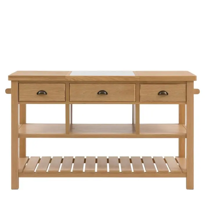 Etonette Kitchen Island: Add extra space and storage to a kitchen with this traditional inspired kitchen island. With country charm and a natural finish, the 3 drawers and shelves, planked lower shelf, and handy hanging rails add practical storage while the wood and marble inlaid top make for the perfect prep surface. Due to the handmade nature of this product, colour variations may be present.