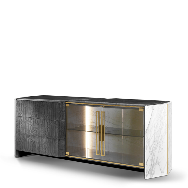 The Algerone Sideboard showcases a medley of luxurious materials while providing practical functionality. The smoked glass doors add a touch of sophistication and offer a glance at the items stored inside. With the powerful presence of Statuario marble and the opulent appeal of polished brass details, this design piece will make a modern statement in any dining room or hallway decor.