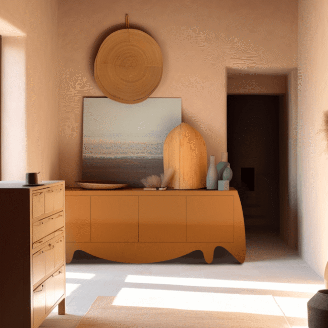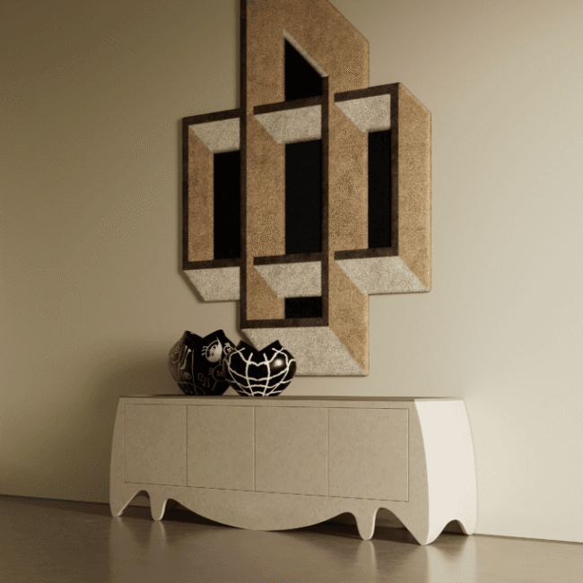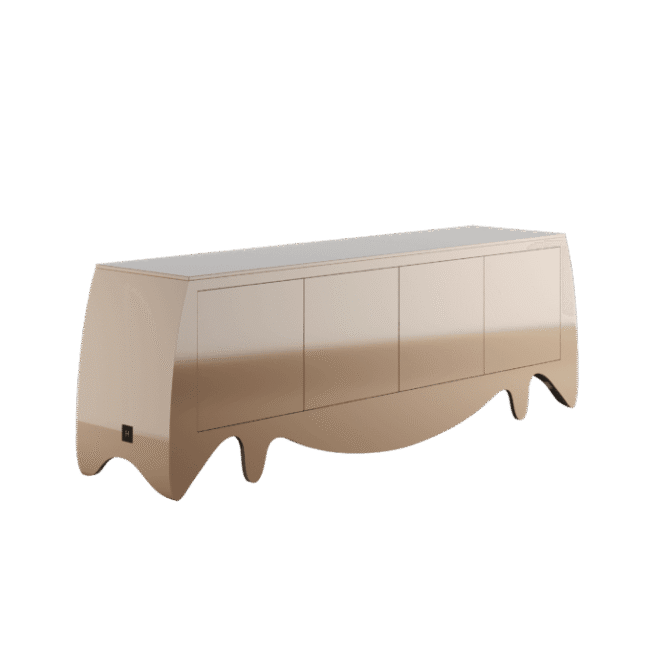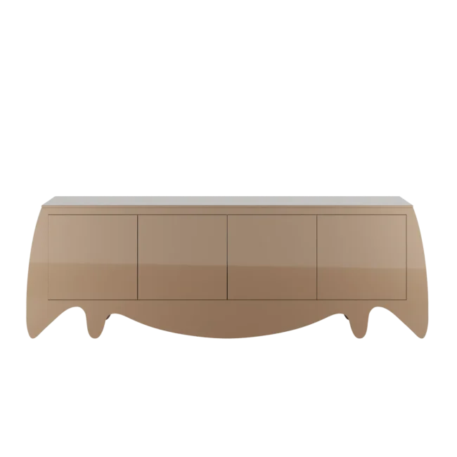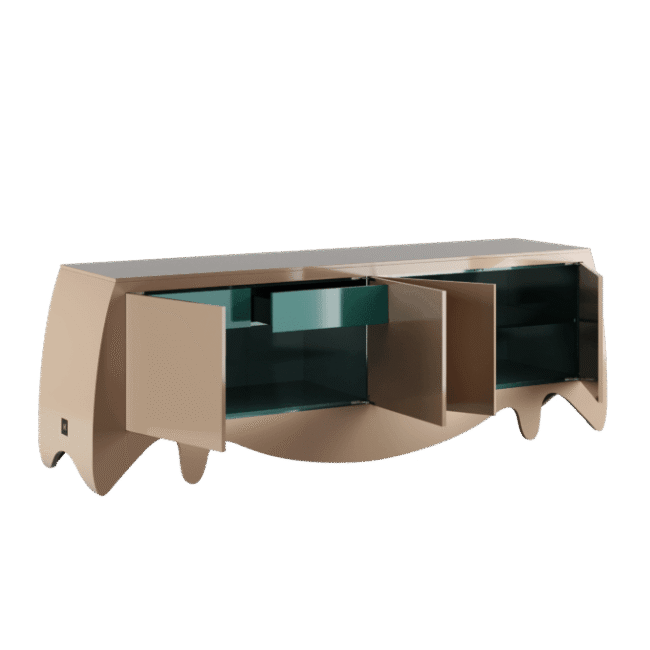 The Camou Sideboard is a trendy furniture piece that adds sophisticated style to any modern interior design project. Its bold combination of colors and shapes allows it to blend seamlessly into contemporary spaces. With its disruptive coloration and finest materials, this luxury buffet resembles a contemporary art piece. Measuring 240 cm (94.5 in) in width, 55 cm (21.7 in) in depth, and 82 cm (32.2 in) in height, it features a body in gloss grey beige lacquer and an interior in gloss blue-green lacquer with a smoked mirror. Enhance your modern interior with the stylish and unique Camou Sideboard. Camou Sideboard