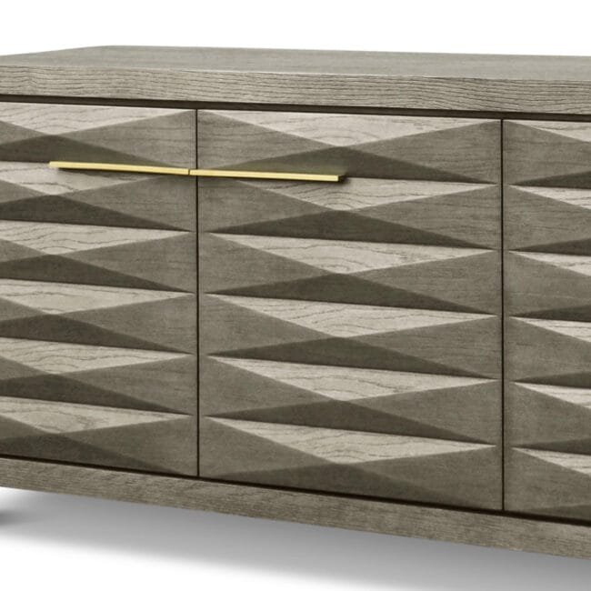 The Cassis 4-Door Sideboard comes in a striking diamond shaped design, which is finished in textured grey/taupe coloured oak veneer and fitted with gold handles. Modern with an inspired design, the Cassis Sideboard can help achieve the perfect finish in any home or interior design project and coordinates perfectly with the Cassis Console Table and the Cassis Coffee Table as well as the Cassis Media Unit.
